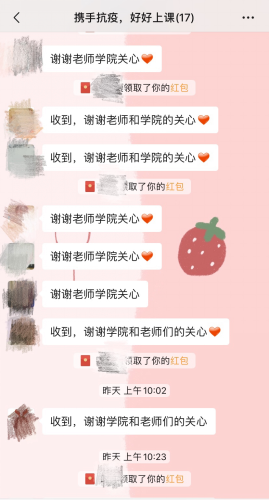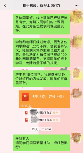 根据学校新学期安排,电子商务学院2月17日开始在线教学,由于部分家庭经济困难学生家中未安装满足参与在线课程学习的宽带,或手机未办理足够流量业务,对线上学习感到“有压力”。3月2日,电商学院组织召开辅导员视频会议,专题讨论家庭经济困难学生网课问题,决定对全部建档立卡学生网上学习情况进行全面摸排,同时对其他获助学金学生、家庭变故学生等家庭经济困难学生也进行排查,全面掌握学生线上学习情况,“不能让任何一名电商同学掉队”。3月3日,电商学院党政班子召开视频会议,决定对摸排出的48名学生提供每人100元的流量资助,由各年级辅导员以“红包”形式线上发放,护航网络课堂顺利进行。