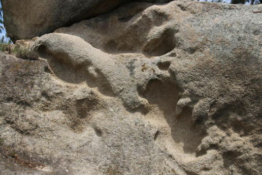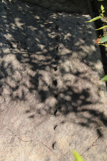 “二梦山”山顶处巨岩林立,怪石嶙峋,实践队在此注意到一块奇特巨石,它高约4米,东侧部分向上突起且尖锐,西侧部分呈扇形铺开,整体形似母鸡,在侧面及中下部分有人工刻凿的纹路及凹穴,当地人称之为母鸡石。在母鸡石东侧20米出的一块巨石上,实践队惊讶的发现了一组奇特的凹穴,疑似古人凿刻的复合式凹穴岩画。这组岩画由于长期的风化侵蚀,其原本图案已难以考证,但依稀可以辨认出飞鸟走兽的形状。