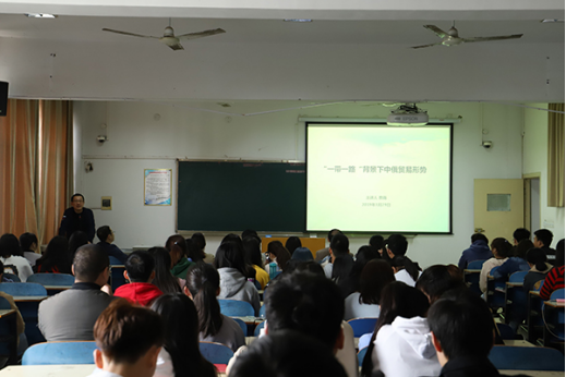 本网讯(通讯员/左伟)为增进学生对俄罗斯的了解,推动中俄教育交流合作。3月29日,电子商务学院在九号教学楼505教室举办“一带一路”背景下中俄贸易形势专题讲座。本次讲座特邀曹雨先生主讲,国际经济与贸易教研室教师金鑫,国际商务教研室教师吕晓军出席,100余名学生参加讲座。