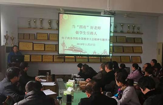 2018年11月27日下午,电子商务学院在9303组织教职工政治理论学习,专题学习全国教育大会精神,党总支书记逯忆以《当“四有”好老师,做学生领路人》为题领学,学院领导班子和全体教师参加。