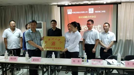 (本网讯 特约记者/田进军) 6月29日,经济管理学院和中原证券南阳分公司校企战略合作协议签订和“大学生就业基地”挂牌仪式在中原证券南阳分公司举行,经济管理学院院长姜保雨、中原证券南阳分公司负责人杨青等参加了签订和挂牌仪式。
