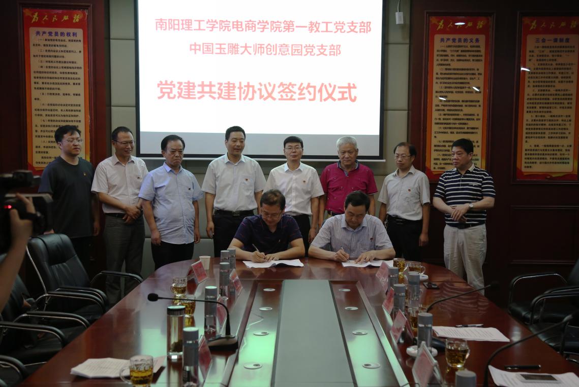 本网讯(通讯员/叶磊)为全面贯彻落实习近平新时代中国特色社会主义思想和党的十九大精神,积极探索创新基层党建工作,深化校企合作内涵,实现校企互利双赢,7月1日上午,在中国共产党成立97周年纪念日当天,电子商务学院第一教工党支部与中国玉雕大师创意园党支部签署党建共建协议,副校长张伟,校党委委员、党委组织部部长董豪,校党委委员、党委统战部部长于元明,镇平县委组织部副部长李珂,中国玉雕大师创意园创始人李杰,电商学院党总支书记逯忆、副院长吴战勇等出席仪式,电子商务学院第一教工党支部与中国玉雕大师创意园党支部党员参加。