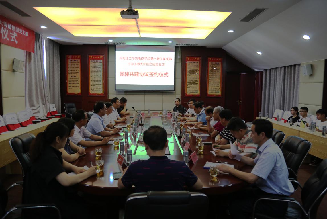 张伟向校企两个基层党组织开展党建共建表示祝贺。他认为,党的基层组织是确保党的路线方针政策和决策部署贯彻落实的基础。电商学院第一教工党支部与大师园党支部作为南阳市表彰的先进基层党组织,按照“推进高校资源与企业资源深度融合,促进高校党建与企业党建水平持续提升”的思路,开展党建共建,既是双方贯彻落实习近平新时代中国特色社会主义思想和十九大精神、创新基层党建工作的有益尝试,更是双方面向未来、携手共进、协力共赢的有力举措;体现了两个基层党组织在抓党建方面求真务实的工作精神和与时俱进的工作作风,也是践行十九大报告提出的推进党的基层组织设置和活动方式创新的重要举措。张伟提出,开展党建共建,一是要把落实放在首位。双方在基层党建各个工作领域加强交流,互相借鉴,互帮互学,将协议列明的事项落入实处,并在实践中总结完善,改进提高;二是把创新作为关键。要在新时代主动适应新形势、新任务、新要求,既要理念创新、思路创新,又要载体创新、方法创新,通过实实在在的创新,探索实践基层党建工作的新形式、新途径、新方法。三是把共赢作为目标。围绕“七个一”重点共建项目,在思想上形成共识、在情感上产生共鸣、在工作实效上实现共赢,真正实现“资源共享、优势互补、携手同行、共谋发展”。