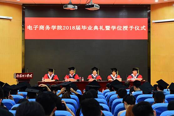 本网讯(通讯员/郎梦鸽)6月19日下午,电子商务学院在我校领创空间二楼报告厅举办2018届毕业典礼暨学位授予仪式,副校长张铟,电商学院院长王一平,总支书记逯忆,副院长吴战勇、郭永奇出席典礼,教师代表、校友代表及在校生代表和2018届应届毕业生200余人参加。典礼由逯忆主持。
