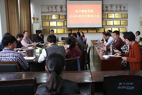 本网讯(通讯员/张瑞皓)4月3日下午,电子商务学院在9号教学楼304会议室召开2018年度民主管理大会。院长王一平,党总支书记逯忆,副院长吴战勇及全体教职工和学生代表参加会议。会议由逯忆主持。