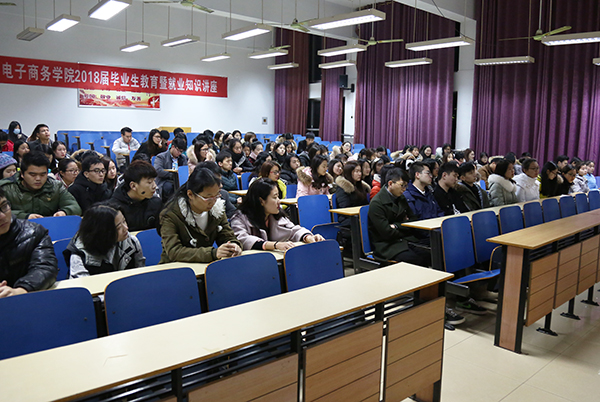 本网讯(通讯员/丁艳)为了帮助学生应对当前严峻的就业形势,加强对毕业生的就业指导与帮助,提升学院毕业生的就业意识,12月14日,电子商务学院在14号教学楼102教室举办2018届毕业生教育暨就业知识讲座。14级辅导员赵杰出席,近200名学生到场聆听。