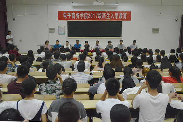 本网讯(通讯员/沈成凤)9月12日,电子商务学院2017级新生见面会暨新生入学教育第一讲在7号教学楼101教室召开,院长王一平、党总支书记逯忆、副院长郭永奇、团学办主任白林驰、17级辅导员张雨爽等出席,全体17级电商学子到场聆听。