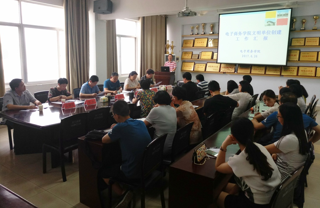 6月26日下午,以安新华为组长,李冉、赵东江、李军、孟建强、段亚楠为成员的学校文明单位考评组到电子商务学院考评文明单位创建工作。院长王一平主持汇报会,党总支书记逯忆汇报学院文明单位创建工作,副院长吴战勇、郭永奇和全体教职工及学生代表参加。