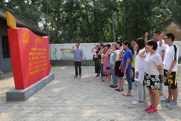 6月18日,在“七一”建党节来临前夕,电子商务学院第一、第二、第三教职工党支部和学生第一、第二党支部师生党员,到黄台岗镇刘宋营村中共南阳第一支部成立旧址,联合开展主题党日活动和“两学一做”学习教育现场体验式“党课”教育,参观党史文化长廊和展厅,重温入党誓词,以革命先辈为榜样,做合格党员,推进“两学一做”学习教育深入开展。