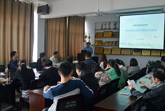 梁秀山从七个方面向在场老师解读了河南省高校专业评价指标体系的要求:一、培养目标明确,制定符合学校定位、适应社会需要的人才培养计划;二、完善课程教学体系,制定合理的教学计划,理论教学与实践教学相结合;三、合理分配教育教学资源,要有雄厚的师资力量和教学、科研成果;四、在教育教学方面要硕果累累,有足量的教学成果奖;五、要建立健全的教学质量保障体系和反馈体系,保障较高的教学质量;六、及时了解毕业生就业情况以及企业反映情况,保持良好的培养质量;七、专业特色鲜明,过程要简单持续有效。此外,梁秀山还特意叮嘱在场教师如何填写本科专业信息填报表。