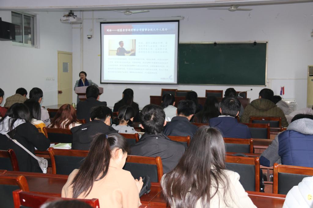 与会人员有经济管理学院院长姜保雨、院书记张良、副院长李晓霞、南阳市企业人员及70余名师生。讲座由李晓霞主持。院领导借此契机聘请刘冰为我院教授,为学生提供学习问题指导。姜保雨院长为刘冰女士颁发聘书并致辞。