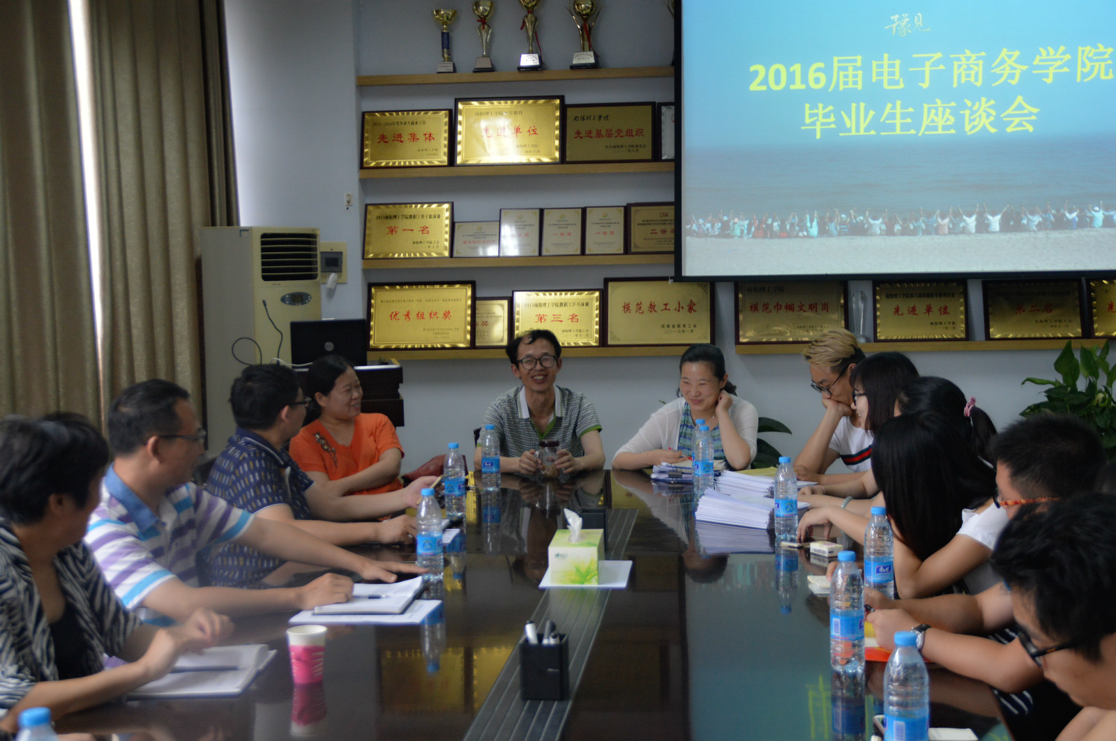 本网讯(通讯员/宋姝娴)6月21日下午,电子商务学院召开2016届毕业生座谈会。学院领导班子全体成员、各教研室主任与教师代表、各年级辅导员和2016届毕业生代表、在校生代表欢聚一堂,共话师生情谊,畅想美好未来。座谈会由电商学院党总支书记逯忆主持。