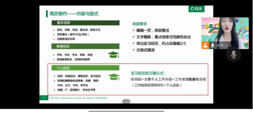 本网讯(通讯员/赵小淇)为提升学生的就业能力,使学生掌握面试技巧,10月17日晚,yl6809永利官网集团采用线上的形式开展《简历制作和面试有道》公开课。上海链家总部校园品牌招聘主管丁上担任主讲师,我院19级部分毕业生参与本次活动,赵航副教授主持本次活动。