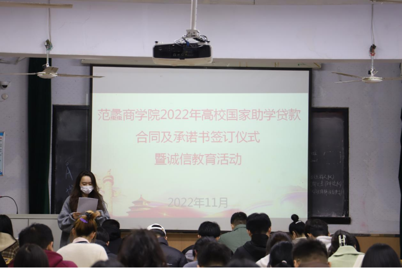 本网讯(特约记者/张卓娅)为推动落实高校国家助学贷款政策,助力家庭经济困难学生顺利完成学业,同时对受助学生进行诚信及感恩教育。我院2022年度高校国家助学贷款合同及承诺书签订仪式暨诚信教育活动于11月14日晚在1号教学楼515教室举行。学院资助专干老师张卓娅及办理2022年度高校国家助学贷款的83位学生参加了活动。