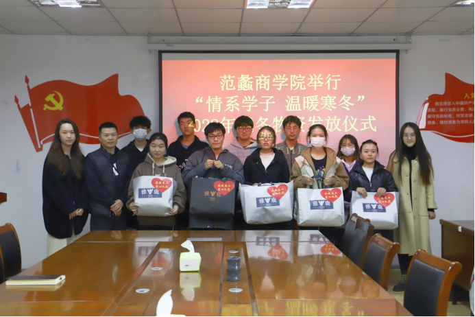 本网讯(特约记者/张卓娅)真情系学子,温暖御寒冬。为进一步贯彻党和国家资助政策,将资助育人落到实处,帮助家庭经济困难学生温暖过冬。2022年11月24日下午,我院在1号教学楼331会议室举行“情系学子 温暖寒冬”2022年越冬物资发放仪式。学院团委书记董博、资助专干张卓娅、辅导员王健平出席,全体受助学生参加。