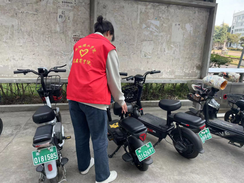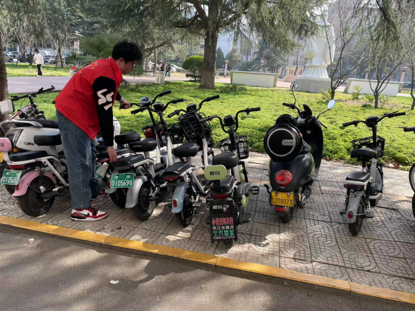 本次活动的主要内容是帮助同学们规范摆放电动车,活动以两人一组进行分工合作。所有同学积极参与当中,不仅把动车规范摆放到指定停车位置上,引导告知未停车同学要规范摆放电动车。