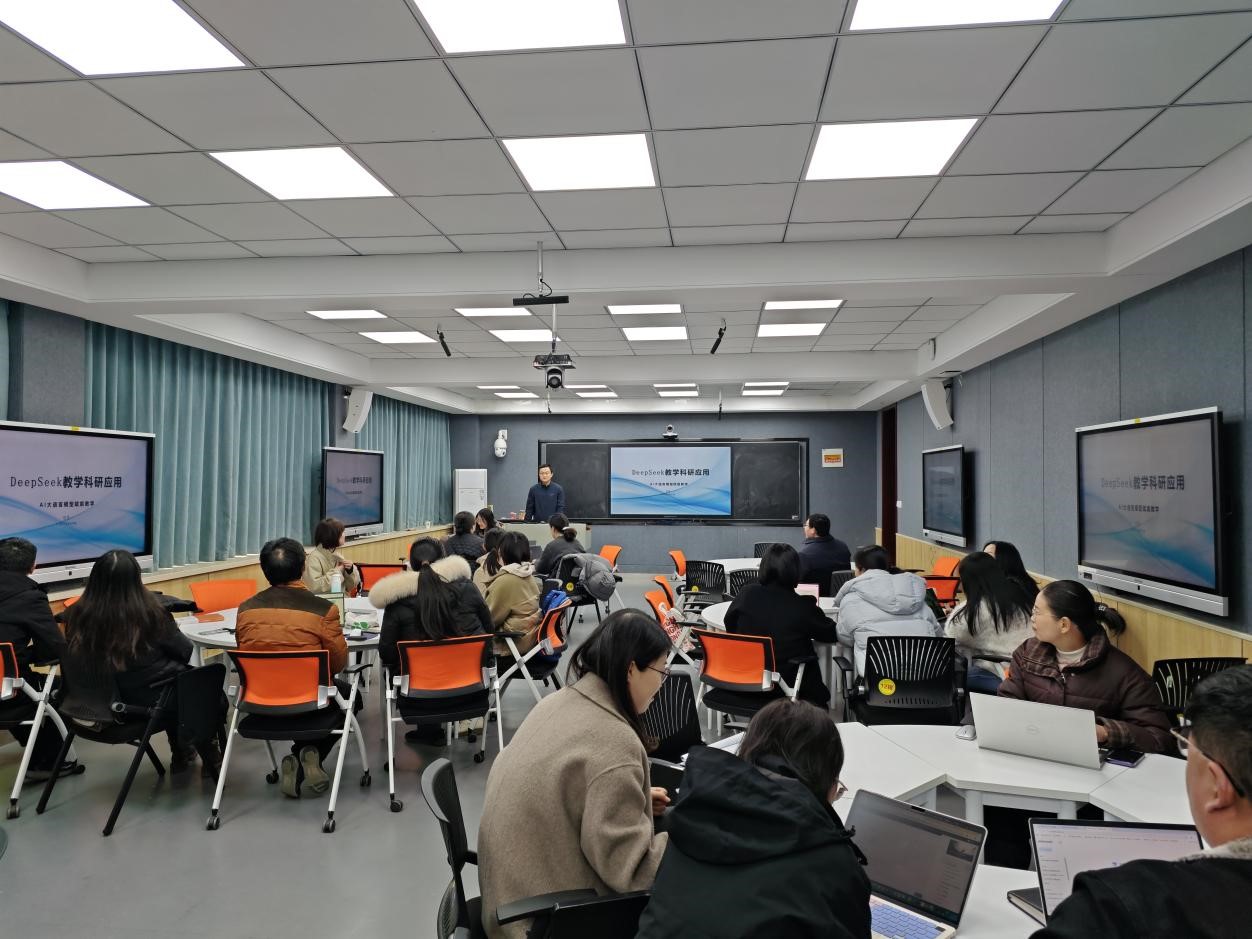 培训以DeepSeek教学科研应用为题,围绕人工智能技术在教学场景应用、科研数据智能分析两大核心方向展开。詹英博士系统介绍了AI的发展及现有平台、AI如何助力个人教学材料创作以及如何在科研中应用等实用场景,并依托真实案例演示了大模型分析工具的操作技巧。参训教师使用电脑同步进行实战演练,在专家指导下完成AI工具使用及个性化任务操作,实现了“学用结合”的培训目标。